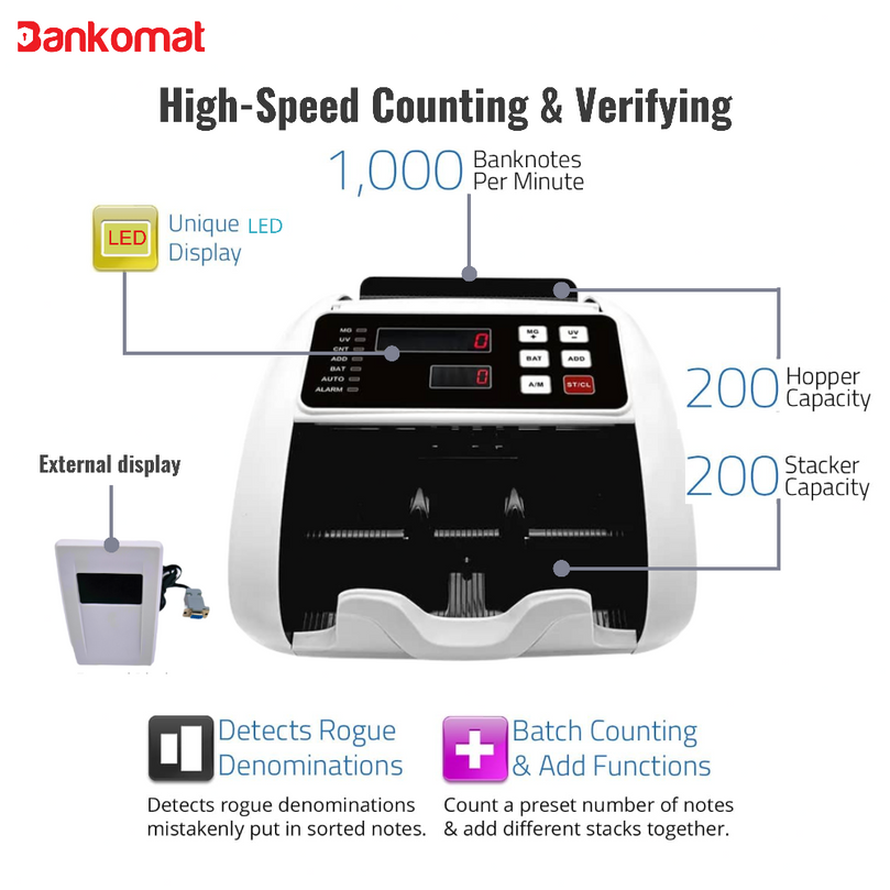 The Note Counting Machine is an advanced and high-performance device designed to handle large volumes of currency with speed and precision. With an impressive counting speed of 1000 pieces per minute, it is perfect for businesses, banks, and other institutions where time efficiency is essential. This machine is capable of counting all denominations of 10, 20, 50, 100, 200, and 500, including both old and new currency notes.